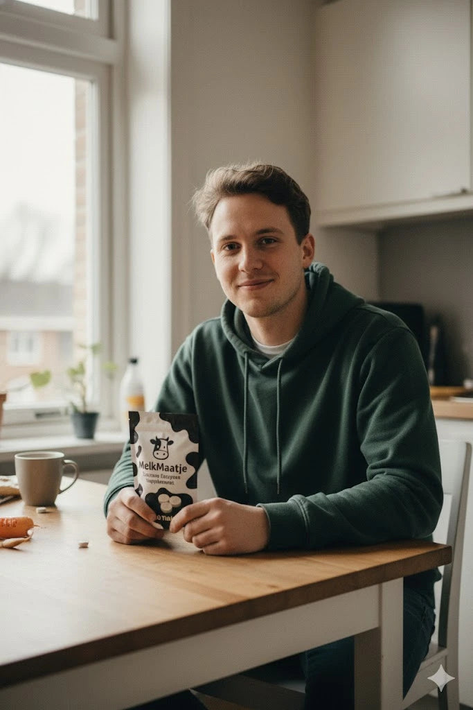 Daarom maakte ik MelkMaatje: supersterke lactase + slimme accessoires, zodat iedereen weer zorgeloos van zuivel kan genieten.